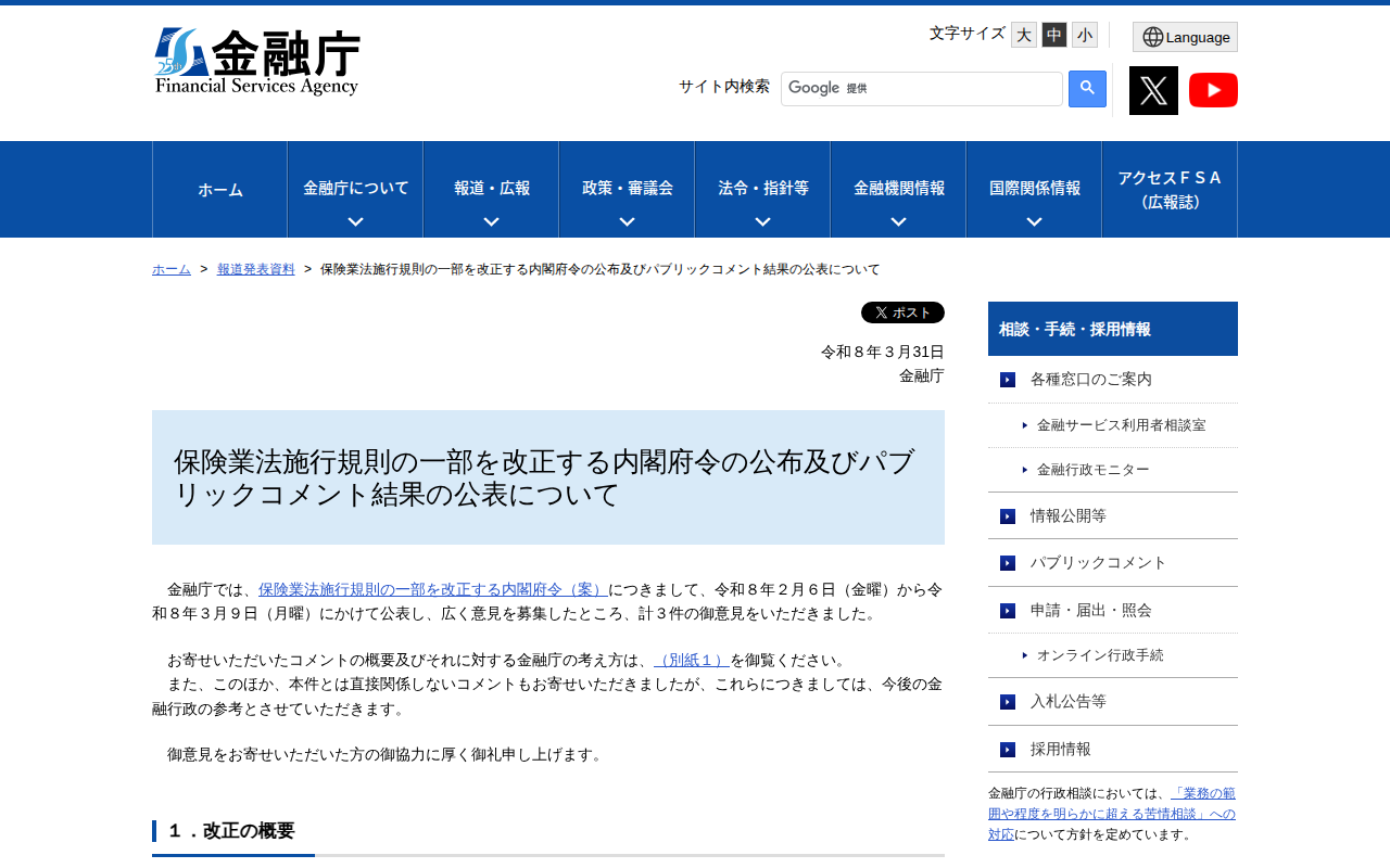 保険業法施行規則の一部を改正する内閣府令の公布及びパブリックコメント結果の公表について:金融庁