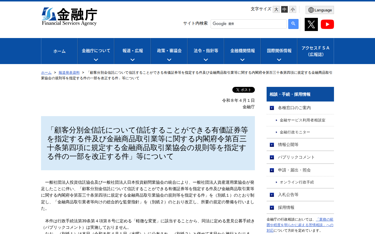 「顧客分別金信託について信託することができる有価証券等を指定する件及び金融商品取引業等に関する内閣府令第百三十条第四項に規定する金融商品取引業協会の規則等を指定する件の一部を改正する件」等について:金融庁