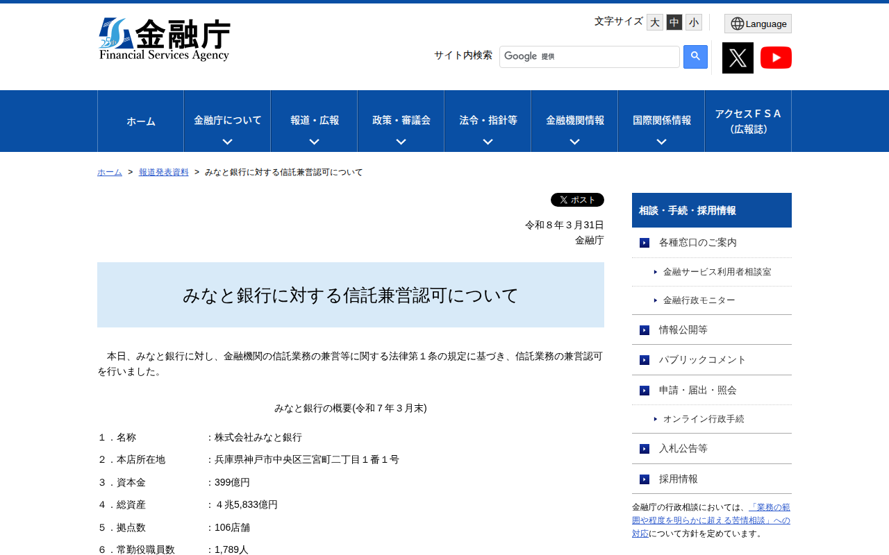 This page announces that the Financial Services Agency approved Minato Bank to conduct trust business operatio...
