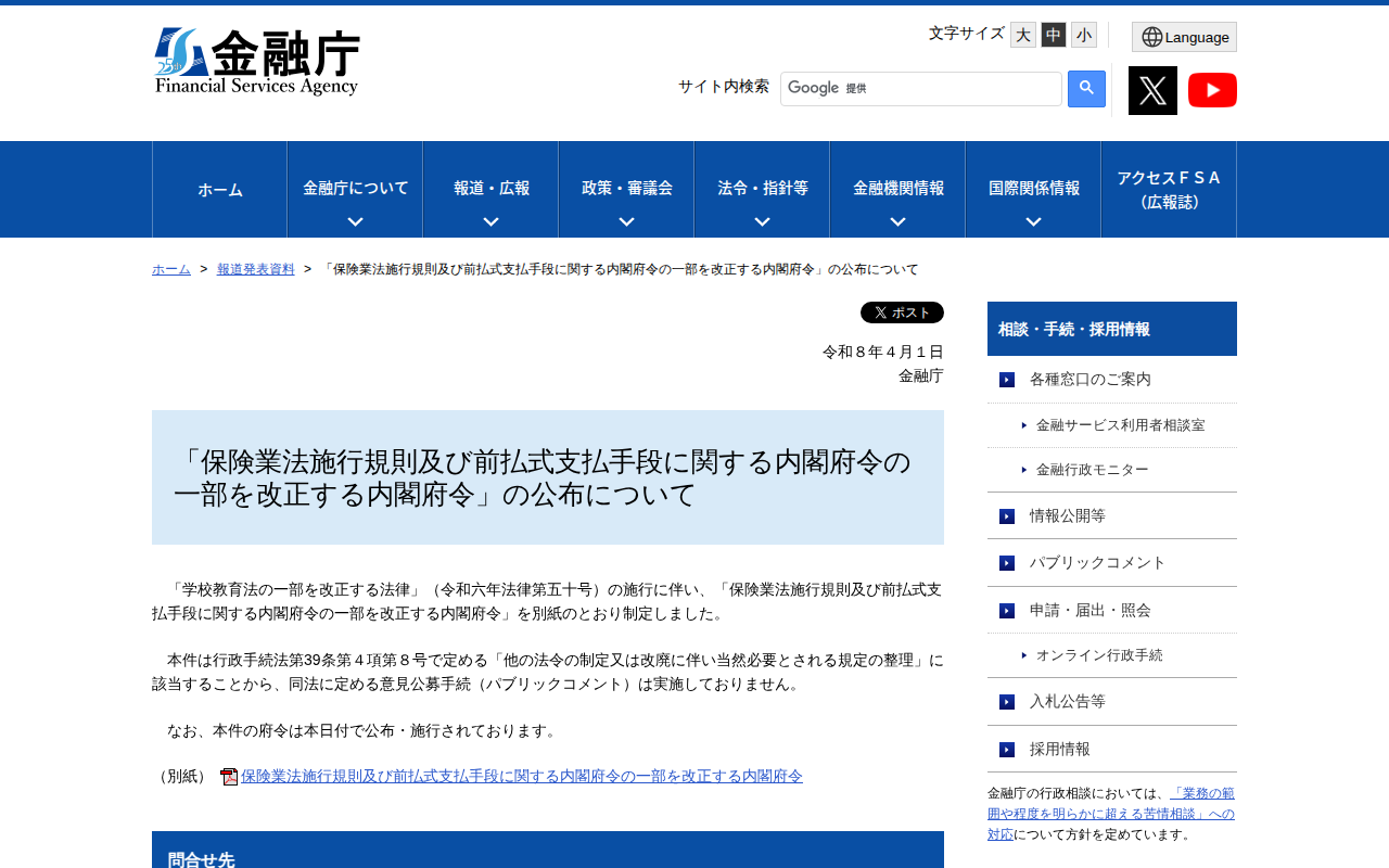 「保険業法施行規則及び前払式支払手段に関する内閣府令の一部を改正する内閣府令」の公布について:金融庁