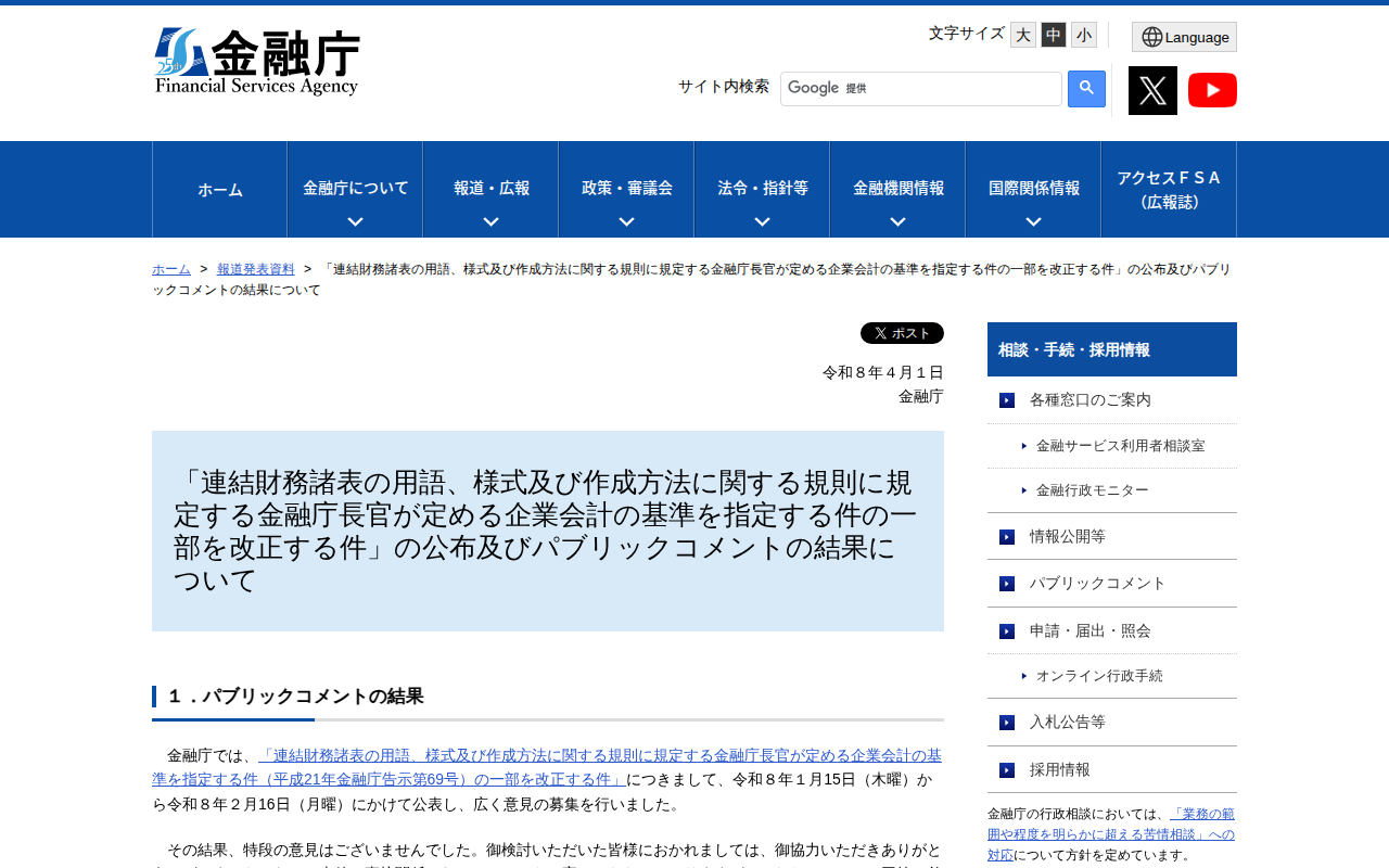 「連結財務諸表の用語、様式及び作成方法に関する規則に規定する金融庁長官が定める企業会計の基準を指定する件の一部を改正する件」の公布及びパブリックコメントの結果について:金融庁