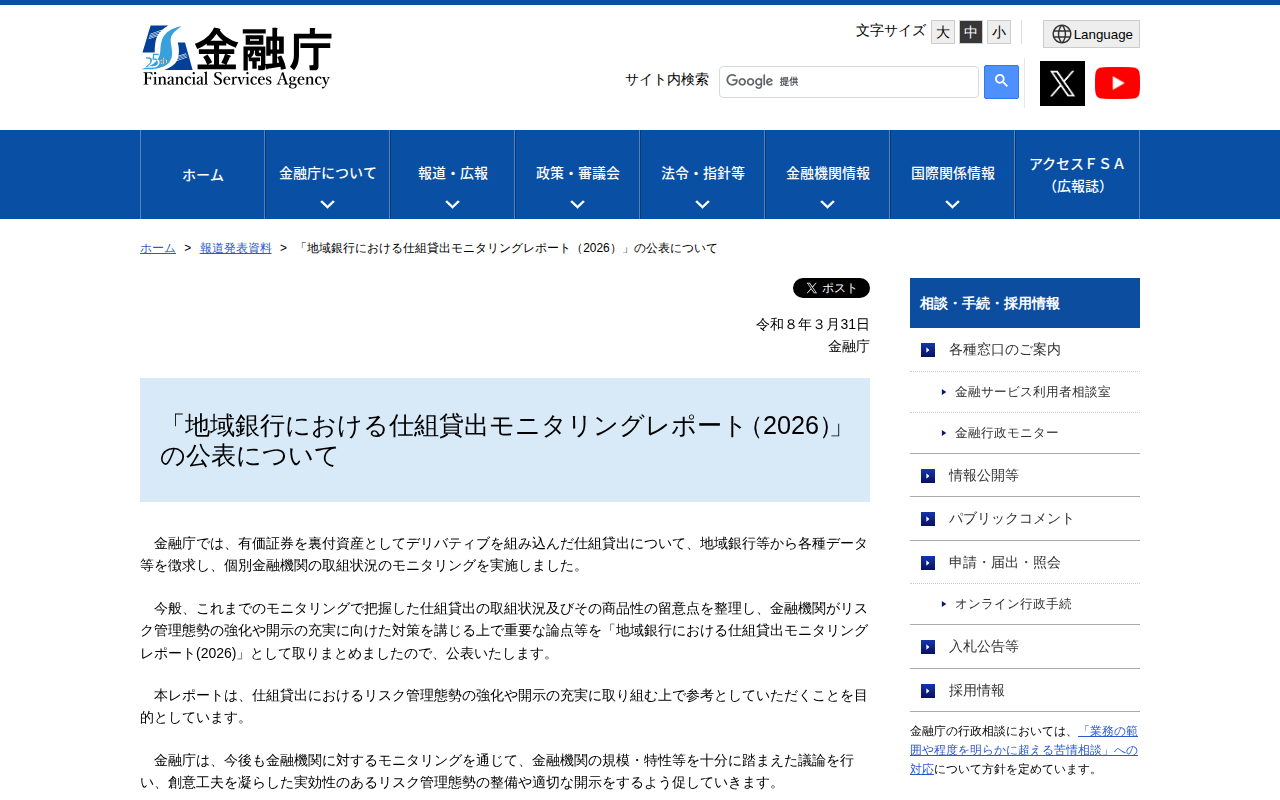 「地域銀行における仕組貸出モニタリングレポート(2026)」の公表について:金融庁