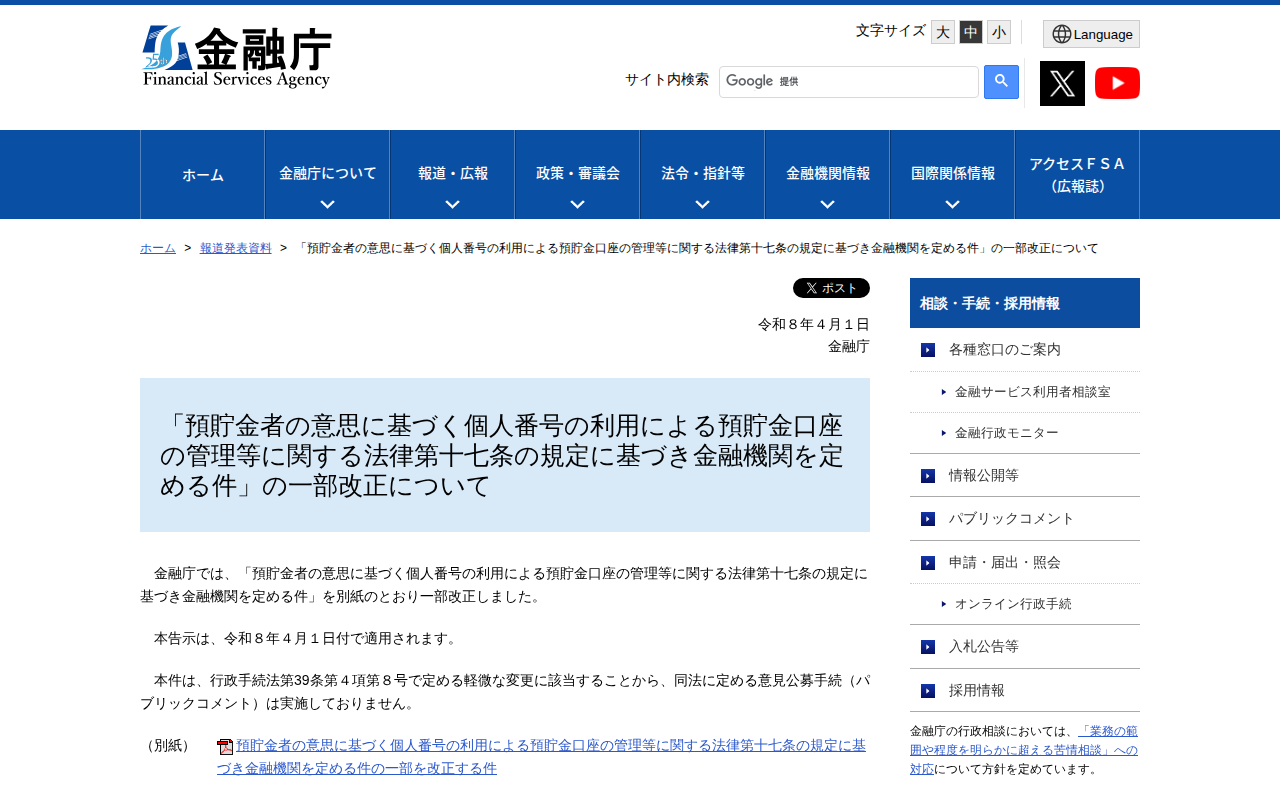 「預貯金者の意思に基づく個人番号の利用による預貯金口座の管理等に関する法律第十七条の規定に基づき金融機関を定める件」の一部改正について:金融庁