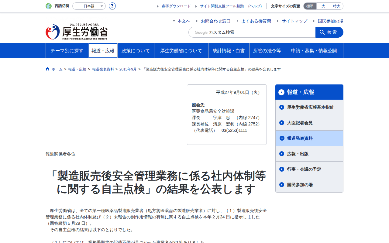 「製造販売後安全管理業務に係る社内体制等に関する自主点検」の結果を公表します|厚生労働省