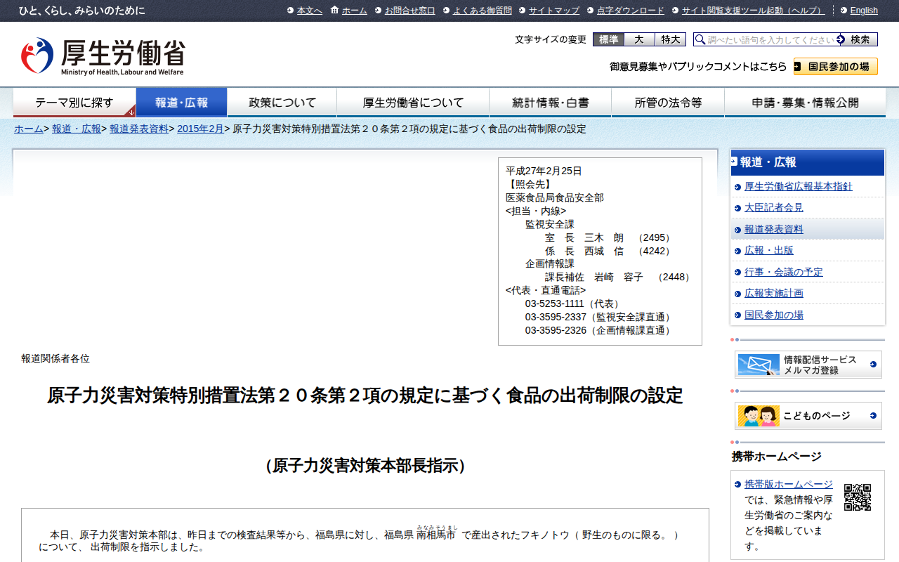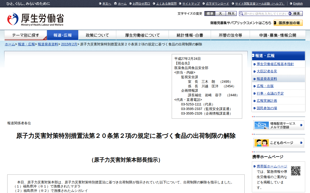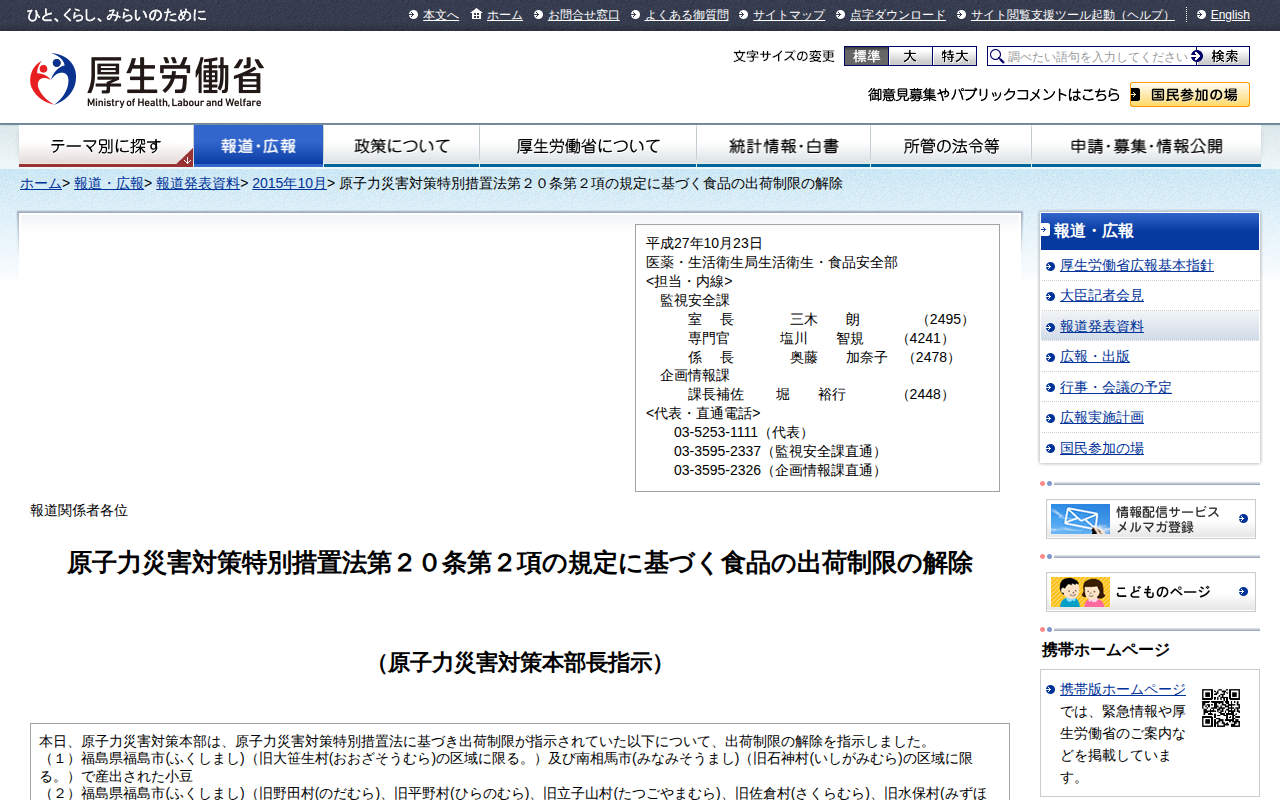 原子力災害対策特別措置法第20条第2項の規定に基づく食品の出荷制限の解除 |報道発表資料|厚生労働省
