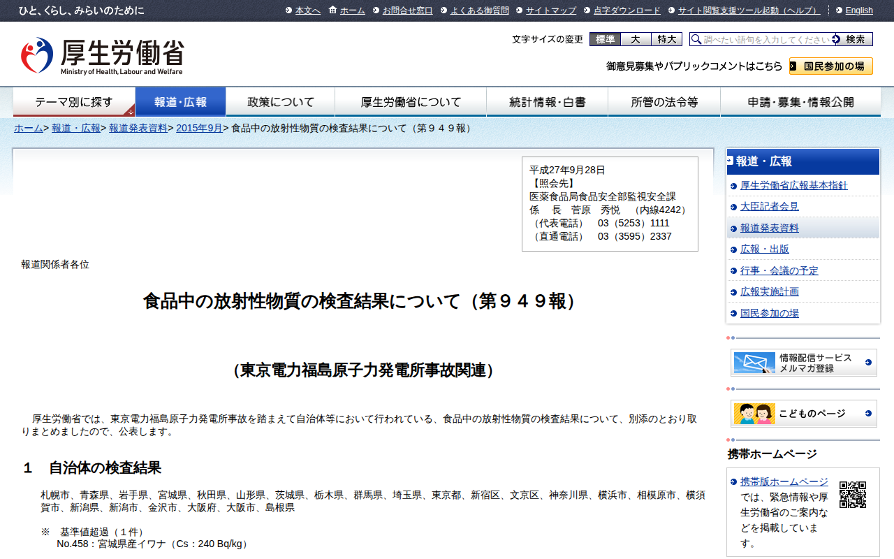 食品中の放射性物質の検査結果について(第949報) |報道発表資料|厚生労働省