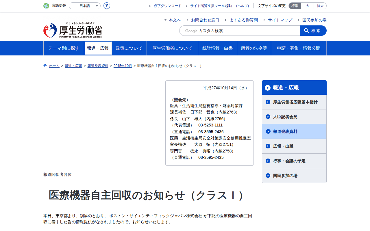 医療機器自主回収のお知らせ(クラスI)|厚生労働省
