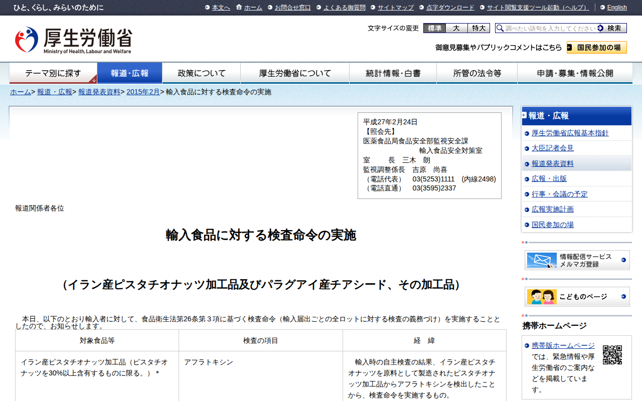 輸入食品に対する検査命令の実施 |報道発表資料|厚生労働省