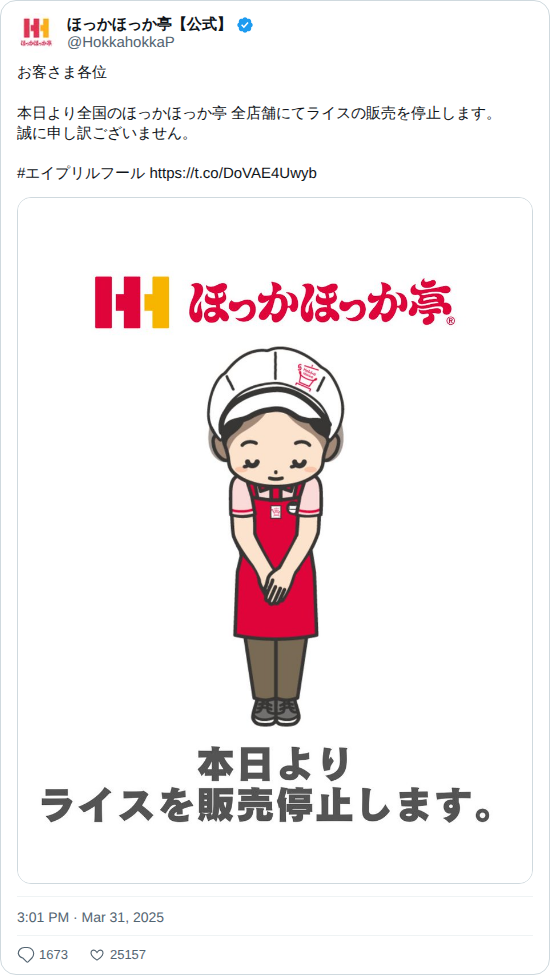 This page is an official post by Hokka Hokka Tei announcing that rice sales will be suspended at all stores na...