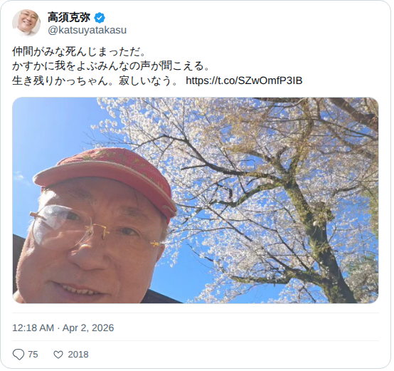 This page is a personal tweet by Katsuya Takasu expressing deep grief over the loss of his companions who have...