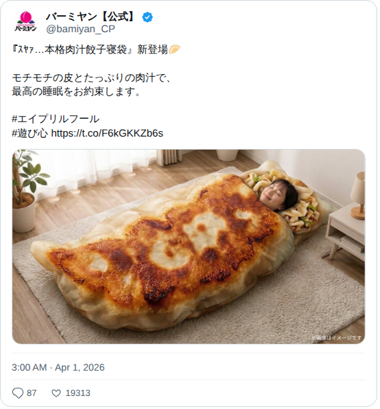This page is an April Fools' joke post from Bamiyan's official X account. It introduces a fictional product ca...