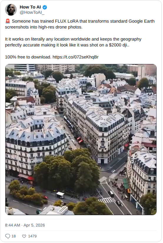 This page announces a trained FLUX LoRA model that converts standard Google Earth screenshots into high-resolu...