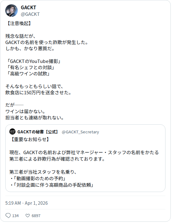 This page raises awareness about fraud using GACKT's name. Scammers impersonated GACKT and his staff, claiming...
