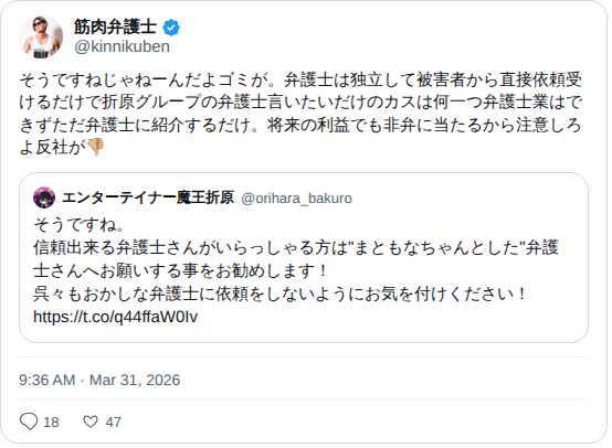 This page is an X post by a user called 'Muscle Lawyer' criticizing unqualified legal practitioners. The post ...