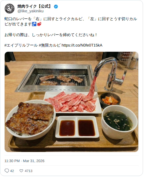 This page features an April Fools' joke post from Yakiniku Like's official account. It humorously describes a ...