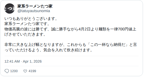 This page is an announcement from Tatsuya Ramen, a tonkotsu ramen restaurant. Due to rising inflation, the res...