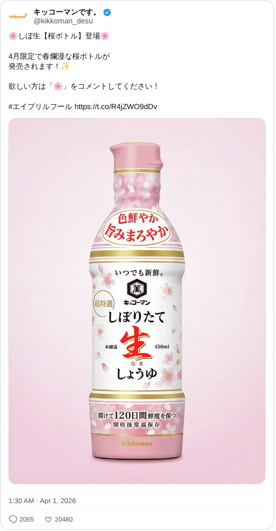 This page is an official announcement from Kikkoman about a limited-edition spring product. A cherry blossom-t...