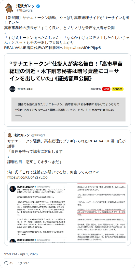 This page reports on a new development in the Sanae Token scandal. A recording released by Bunshun magazine re...