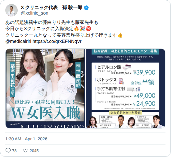 This page is a post by the representative of X Clinic announcing that the popular doctors Fujishiro Riri and F...