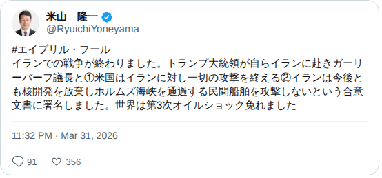 This page is an April Fools' joke post by Ryuichi Yoneyama. It describes a fictional scenario where the war in...