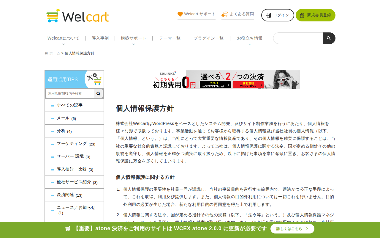 個人情報保護方針 | 【公式】Welcart |SEOに強い!初めてでも安心の無料ネットショップ作成ツール