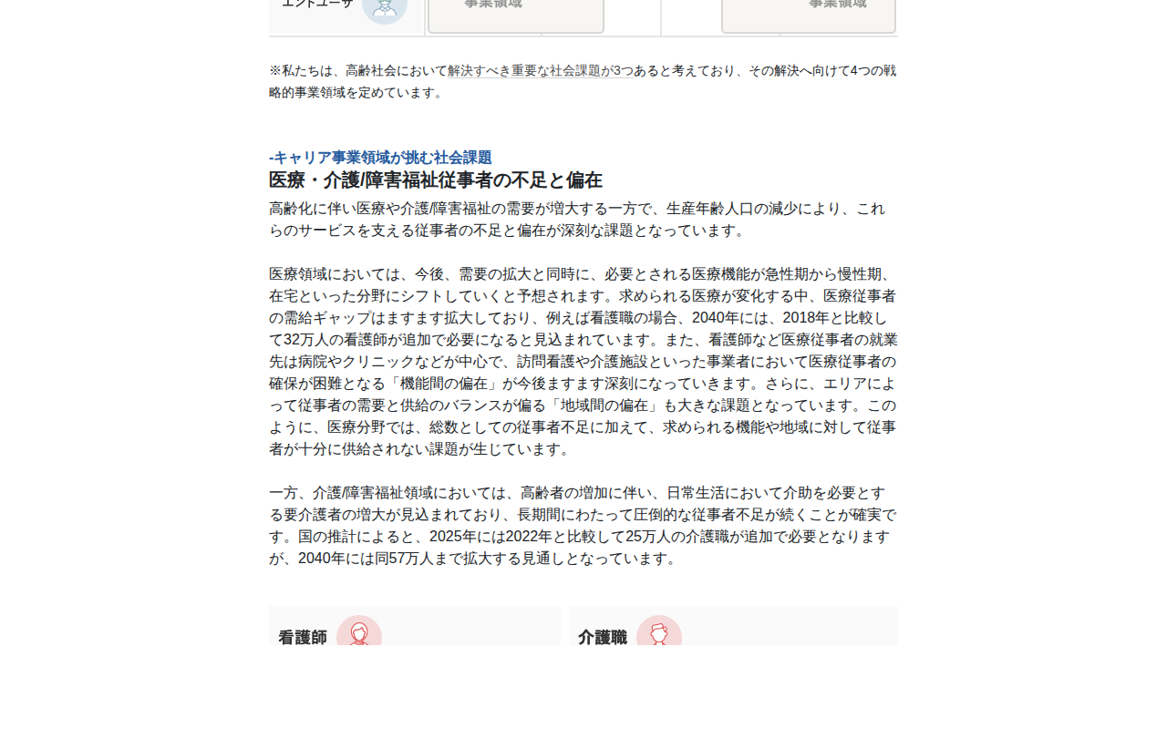 This page describes BM・SMS's Career business domain, addressing workforce shortages and maldistribution in healthcare, c