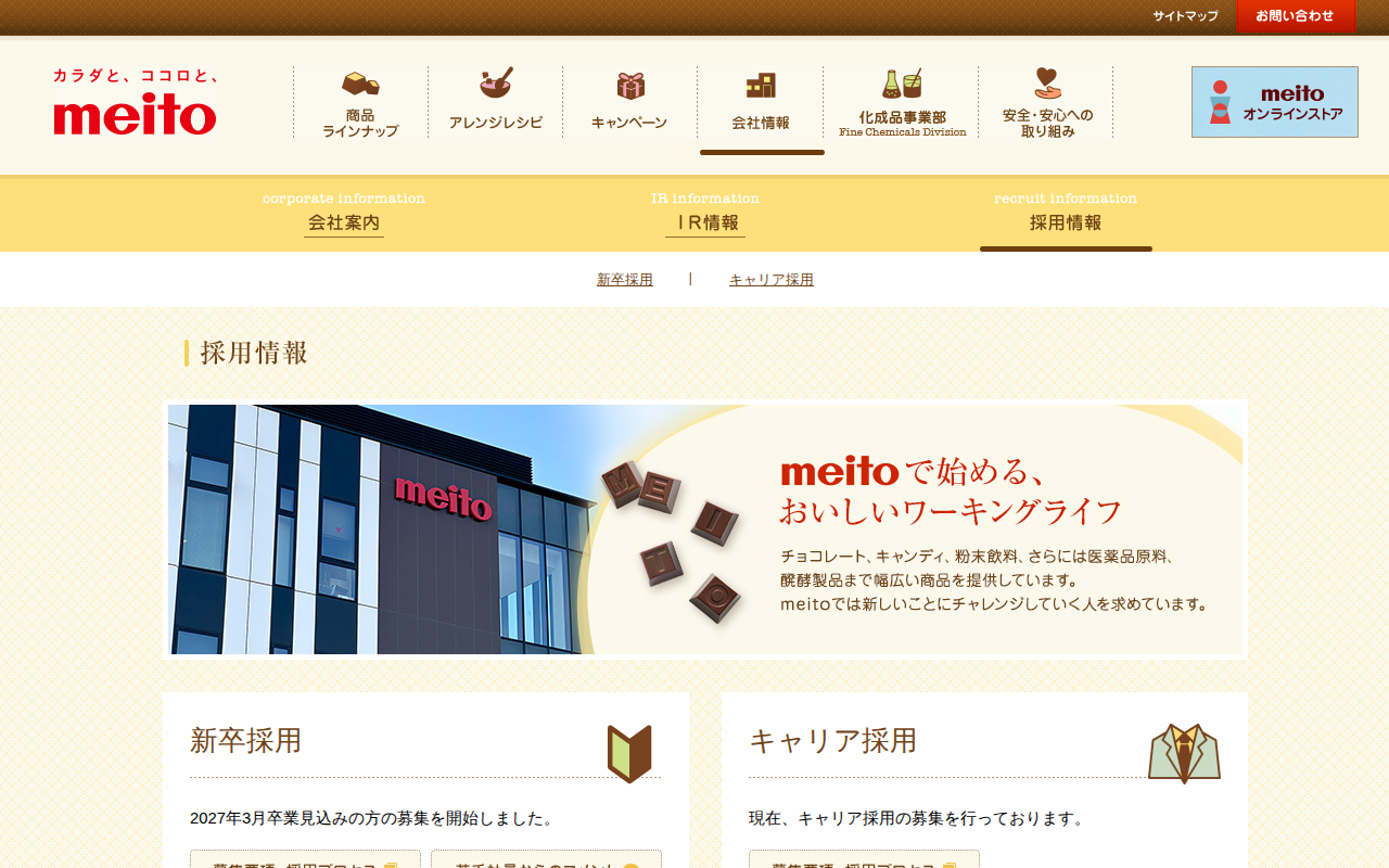 This page presents recruitment information for Meito Co., Ltd. The company is recruiting new graduates expected to gradu