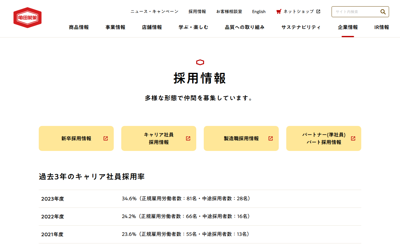 This page presents recruitment information for Kameda Seika Co., Ltd., a rice cracker manufacturer. The company recruits