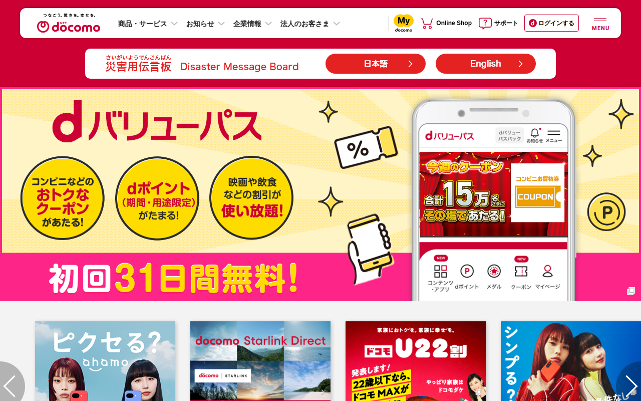 This page is NTT DOCOMO's official website providing information about mobile phones, smartphones, internet services, an