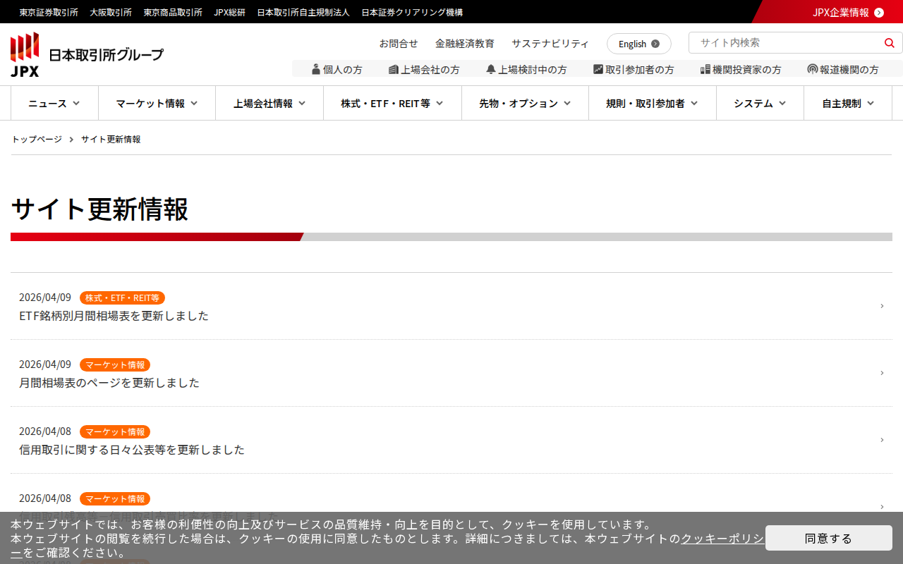 www.jpx.co.jp/site-updates/index.html web archives are listed here. You can still review the saved screenshot and HTML even if the original page disappears.
