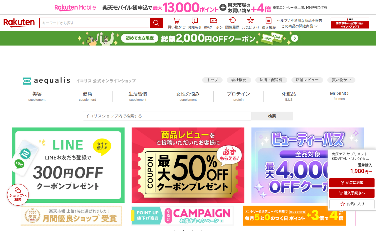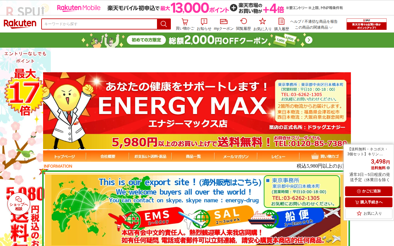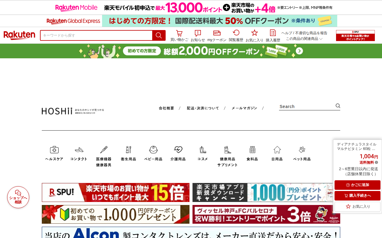 このページは、楽天市場で販売されている小林製薬のマルチビタミン+ミネラル+必須アミノ酸サプリメント(120粒)の商品ページです。ビタミン13種、ミネラル9種、必須アミノ酸8種を配合した栄養機能食品で、1,734円(送料無...