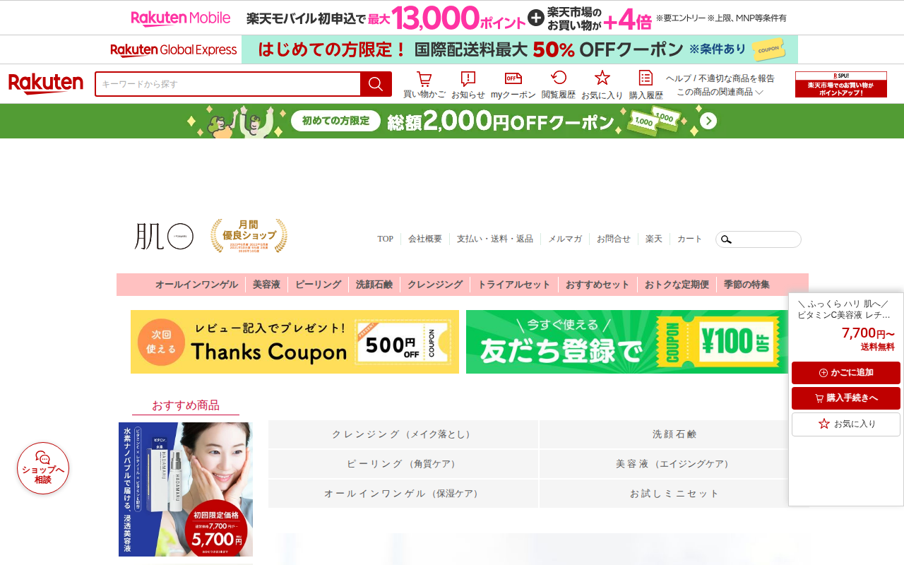 このページは、楽天市場で販売されている「肌〇 ハイドロビタセラム」という美容液の商品ページです。水素ナノバブル配合により、ビタミンC・レチノール・ビタミンEの3種類のビタミンと13種類のアミノ酸を肌に浸透させやすくする製...