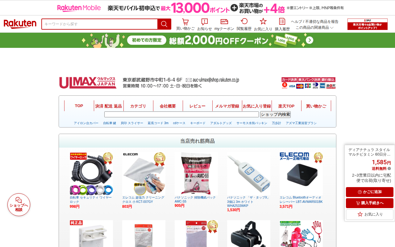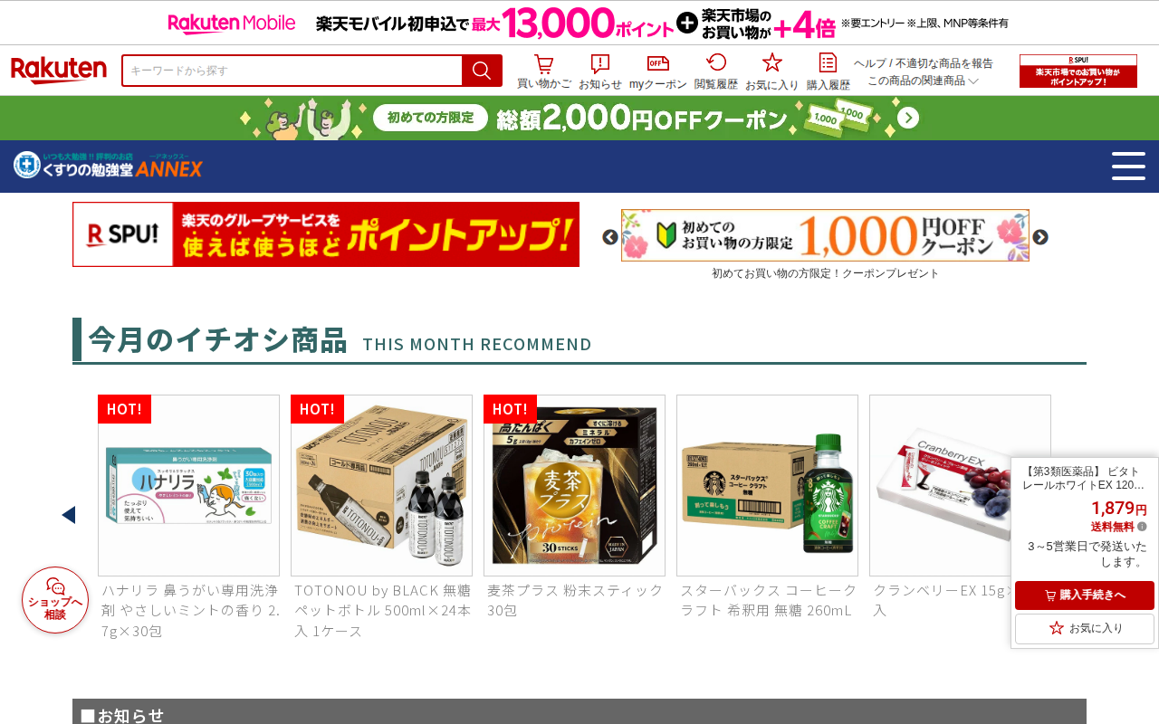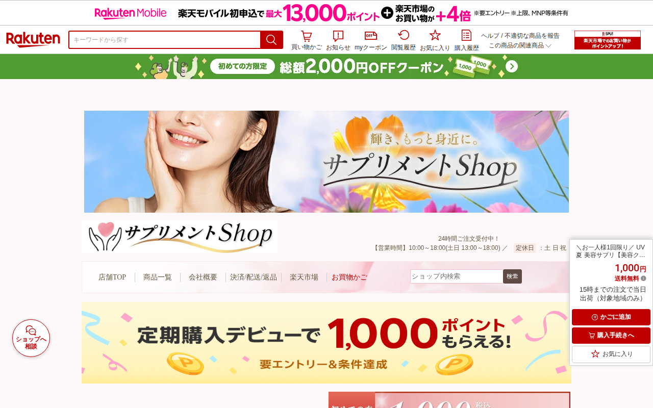 このページは、楽天市場で販売されているUV対策美容サプリメントの商品紹介ページです。美容クリニック医師監修で、L-シスチン、アスタキサンチン、ハトムギなどを配合し、ビタミンC3,000mgを含む24種の美容成分を配合して...