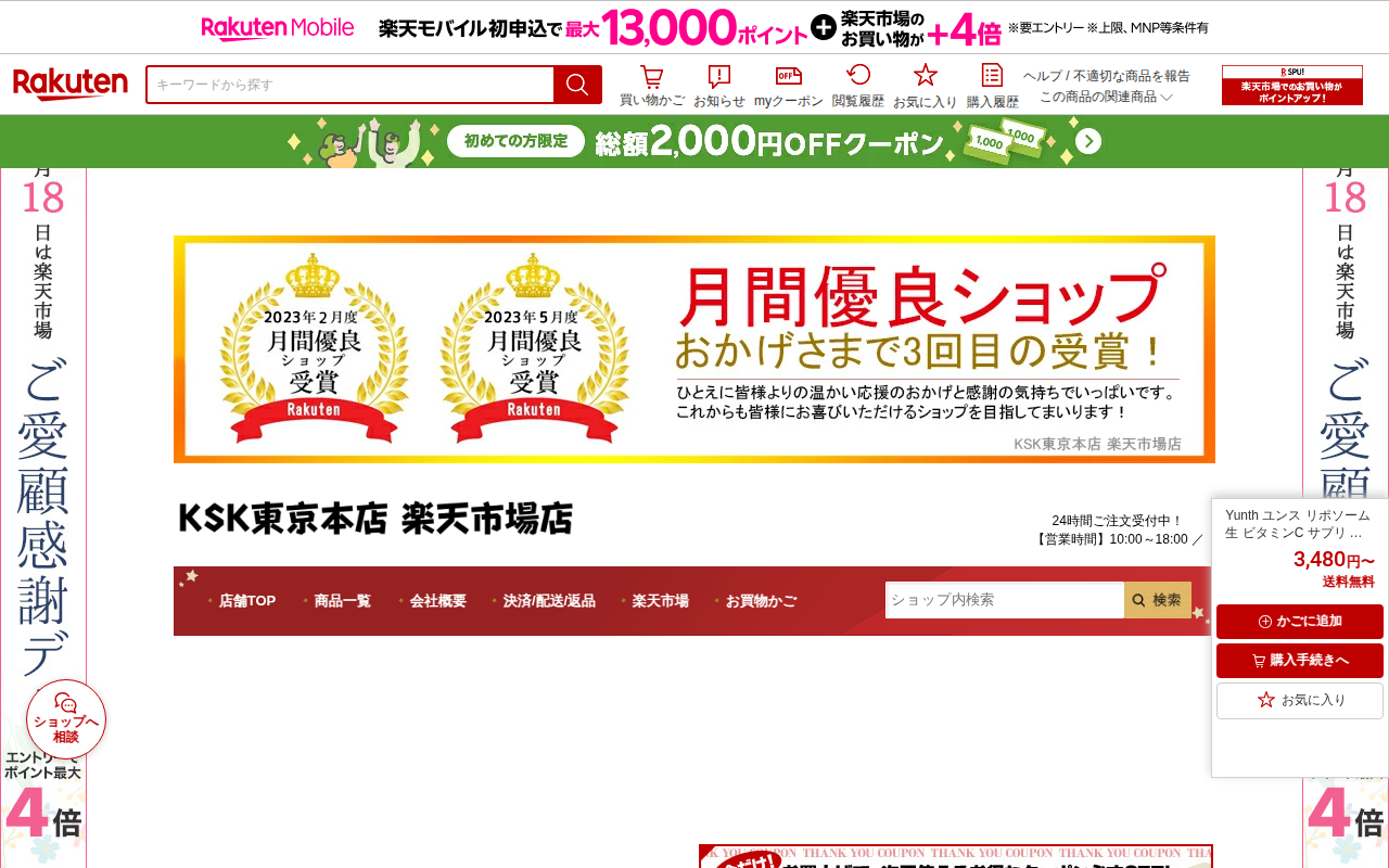 このページは、楽天市場でYunthのリポソーム生ビタミンCサプリメントを販売する商品ページです。レモン風味のスティック型サプリで、1本あたりレモン約100個分(2,000mg)の高濃度ビタミンCを配合しています。高吸収型...