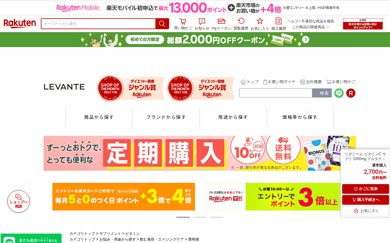 このページは、楽天市場で販売されているリポソームビタミンCサプリメントの商品紹介ページです。1000mgのピュアビタミンCとグルタチオン含有酵母エキスを配合した栄養機能食品で、30日分です。通常購入は2,700円から、定...