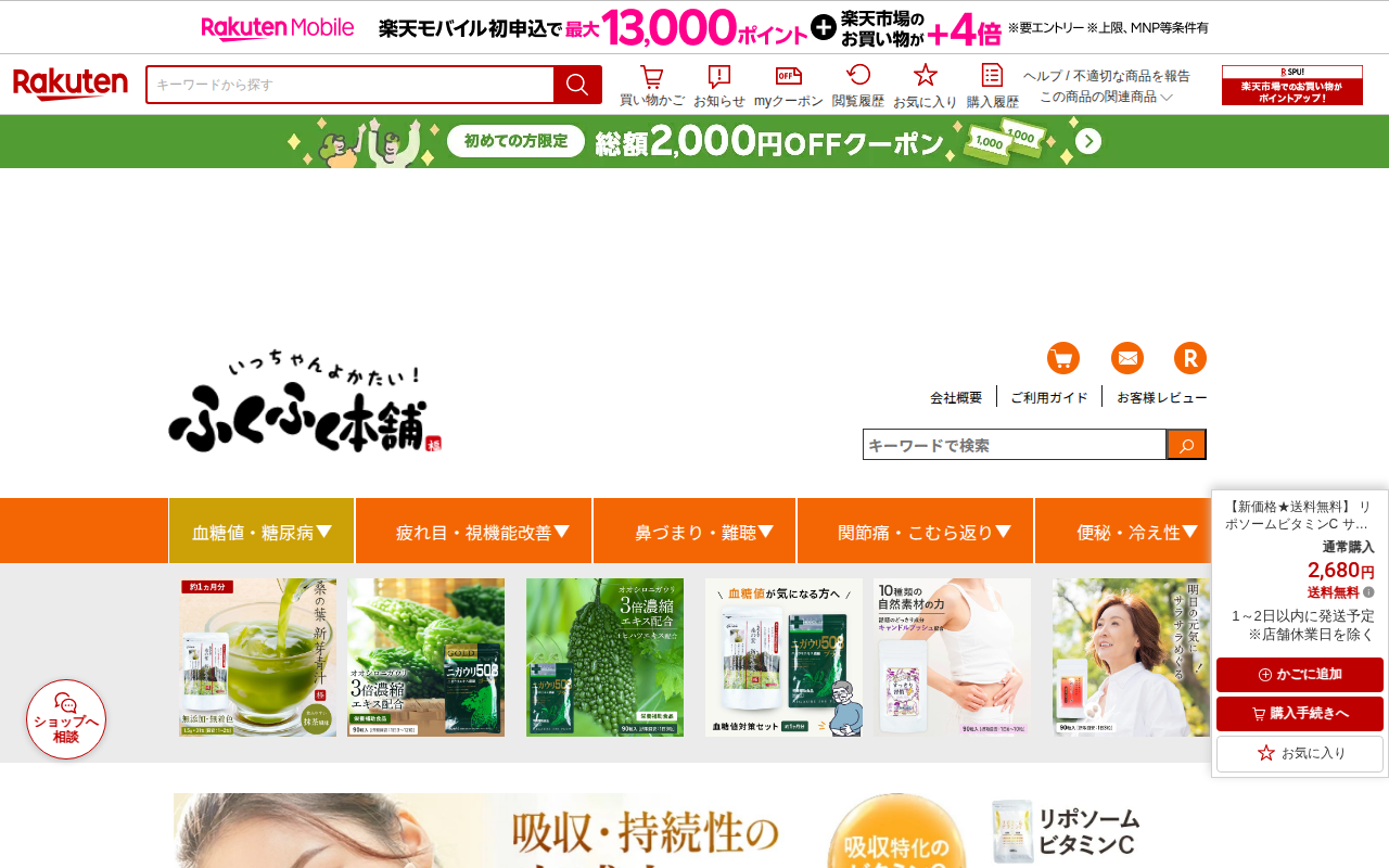このページは、楽天市場のふくふく本舗で販売されているリポソームビタミンCサプリメントの商品ページです。60粒入り1ヶ月分で、ビタミンC1000mg配合の美容サプリです。通常購入は2,680円で送料無料、1~2日以内に発送...