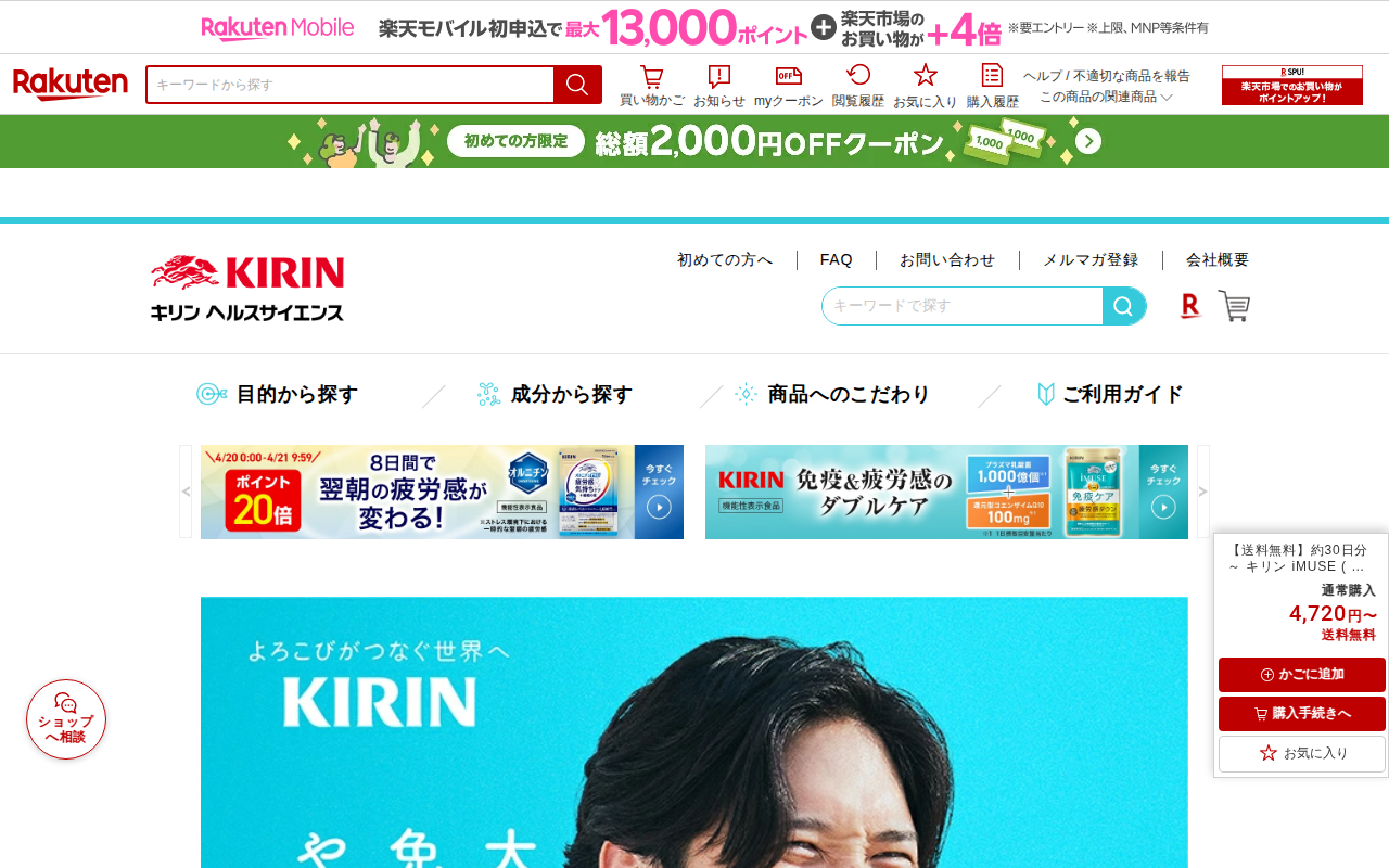 このページはキリンの機能性表示食品「iMUSE 免疫ケア+マルチビタミン8種」の楽天市場での販売ページです。プラズマ乳酸菌1,000億個と8種類のビタミン(A、B1、B2、B6、B12、C、D、E)を配合したサプリメント...