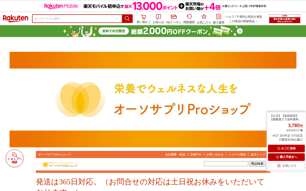 このページは、楽天市場で販売されているオーソサプリのD3フィッシュオイルサプリメントの商品ページです。タラ油を主成分とし、ビタミンDやオメガ3脂肪酸を含む90粒入りのサプリメントで、価格は3,780円(送料660円)です...