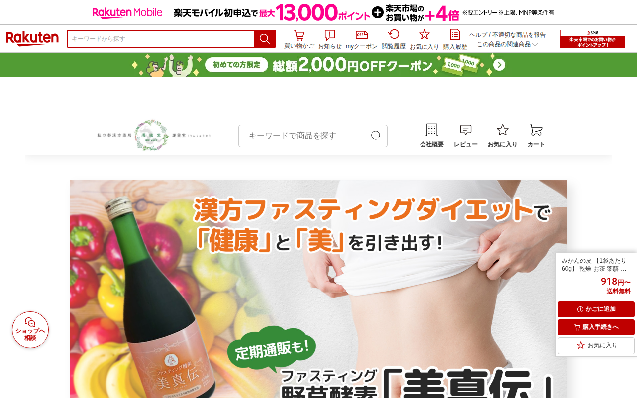 このページは、仙台の漢方専門薬局「運龍堂」が販売する乾燥みかんの皮(陳皮)の商品紹介ページです。60g単位で販売され、918円から購入できます。薬膳茶として、また料理の香り付けやお菓子作り、入浴剤として利用できます。中国...