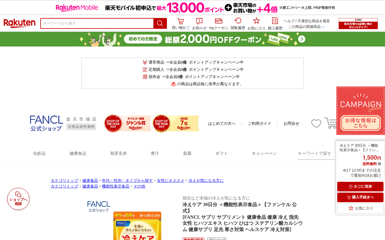 このページはファンケル公式の楽天市場店で販売されている「冷えケア 30日分」という機能性表示食品のサプリメント商品です。女性に多い末端冷えの悩みに対応した日本初の機能性表示食品で、ヒハツ由来ピペリン類を含み、寒冷刺激によ...
