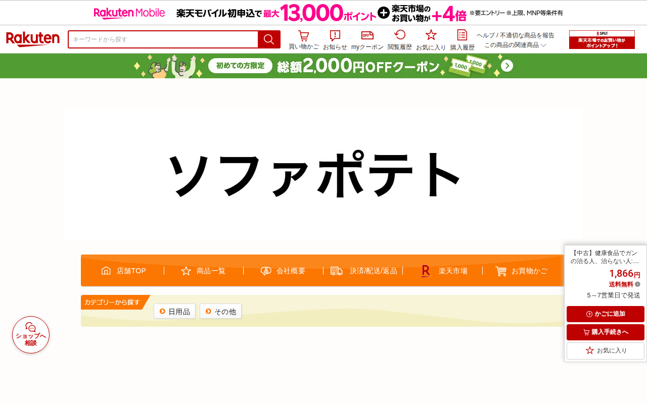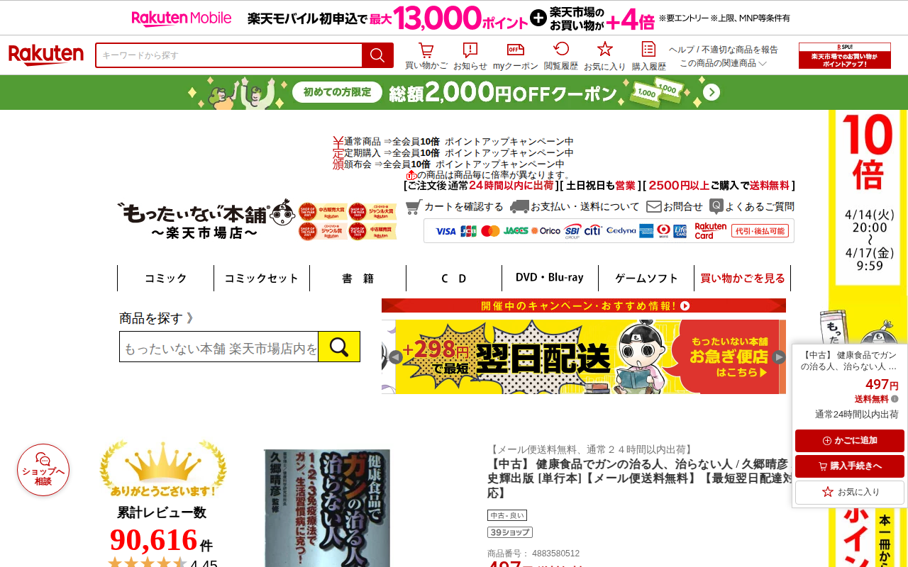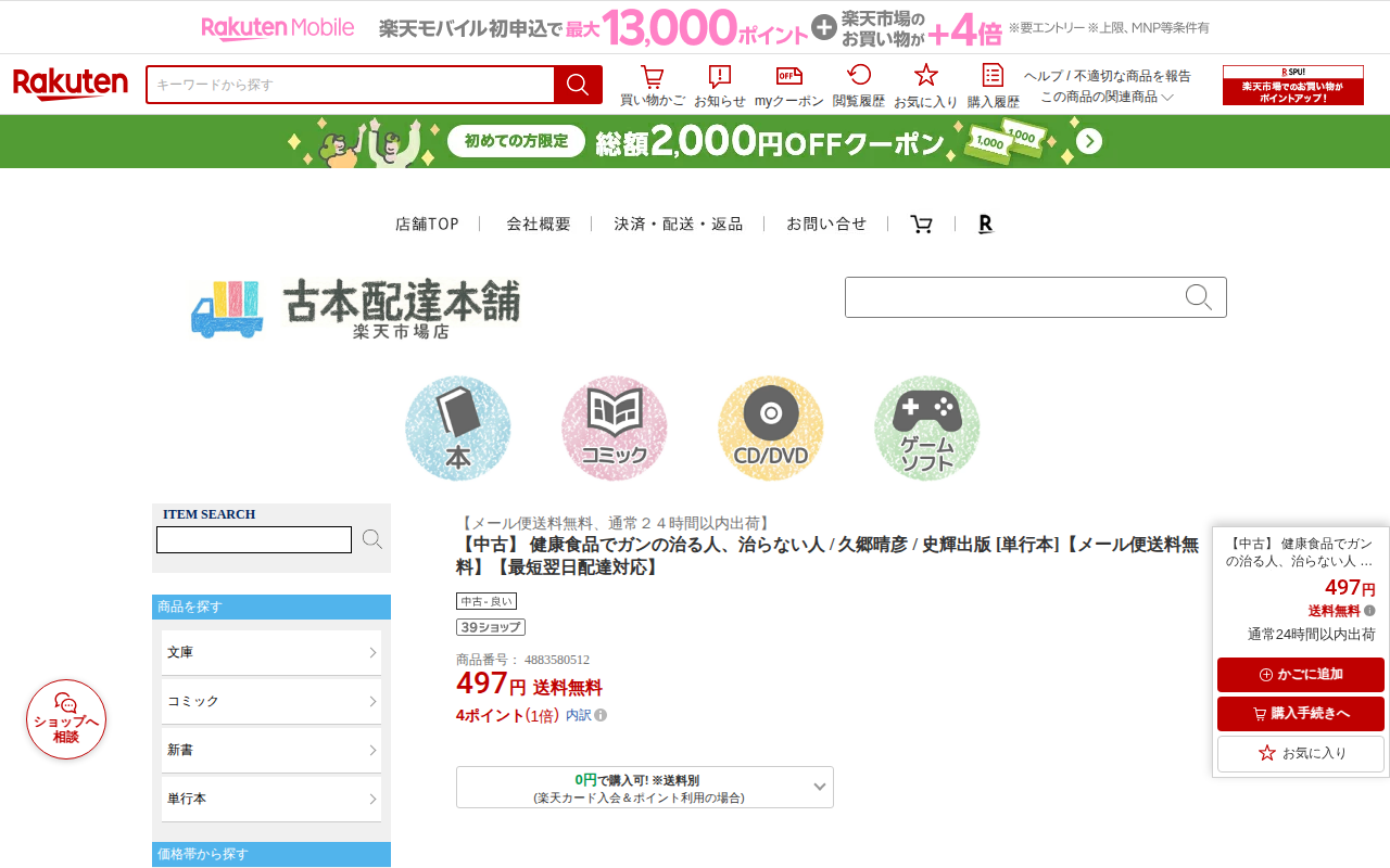 このページは、楽天市場の「もったいない本舗」が販売する中古本の商品ページである。著者・久郷晴彦、出版社・史輝出版による『健康食品でガンの治る人、治らない人』という単行本を、497円(送料無料)で販売している。メール便での...
