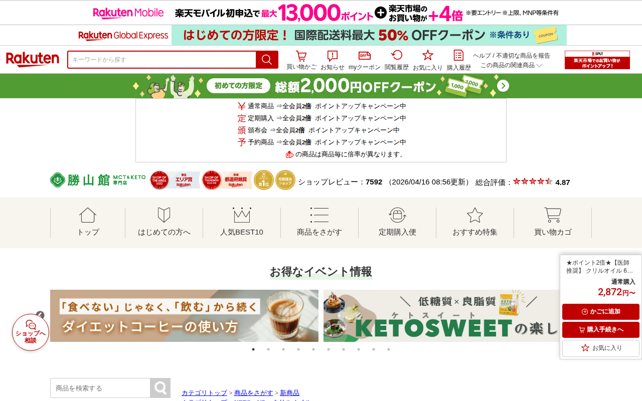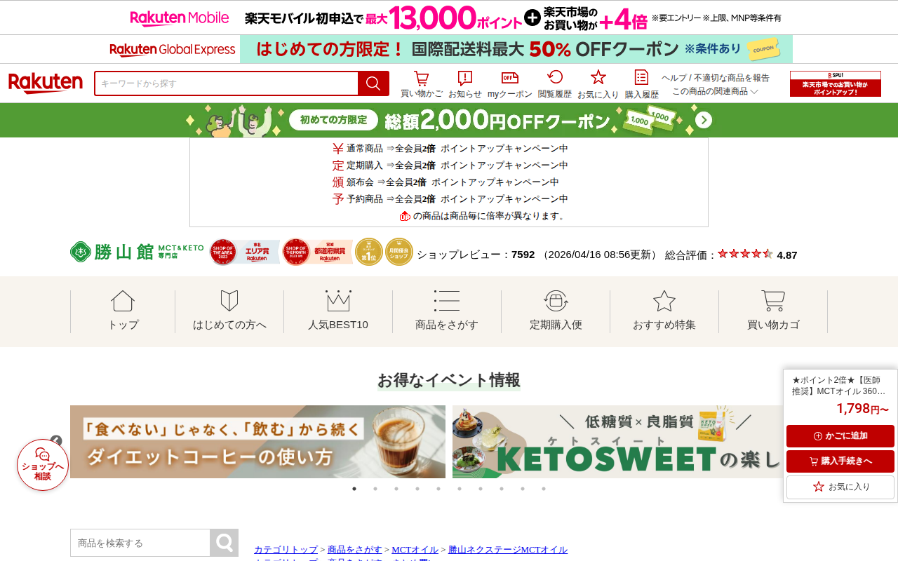 このページは、楽天市場で販売されている仙台勝山館のMCTオイル360gの商品ページです。医師推奨の高純度・高品質MCTオイルで、1本1,798円から購入でき、複数本セットの割引オプションもあります。ポイント2倍キャンペー...