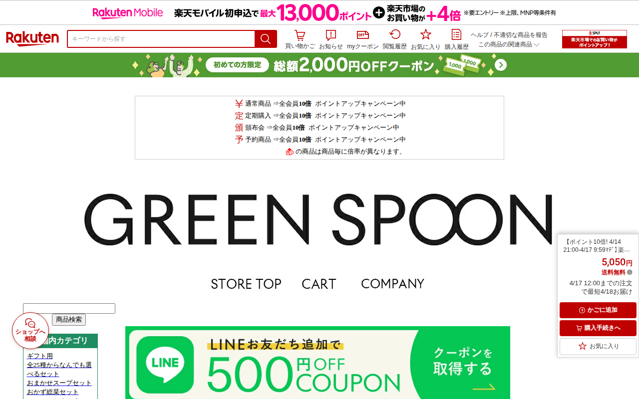 このページはGREEN SPOON公式の楽天市場店で販売される、選べる野菜スープ4食セットの商品ページです。価格は5,050円で送料無料、ポイント10倍キャンペーン対象(4月14日~17日)です。西京味噌豚汁、ポルチーニ...