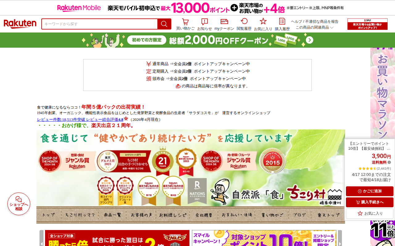 このページは、楽天市場で販売されている「ちこり村」の有機黒にんにく訳あり商品の紹介ページです。1945年創業のサラダコスモが運営し、有機JAS認証を取得した黒にんにくを1kg(22~27玉目安)3,900円で送料無料で販...