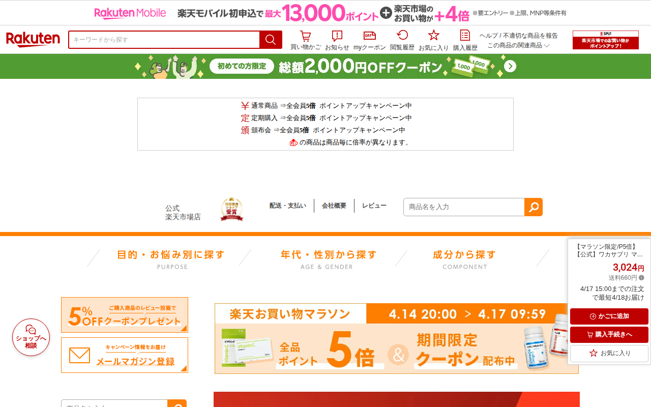 このページはワカサプリ公式楽天市場店で販売されているマグネシウムサプリメントの商品ページです。60粒入りで約2か月分の健康食品で、価格は3,024円(送料別)。1粒あたりマグネシウム175mgを含有し、国内製造されていま...