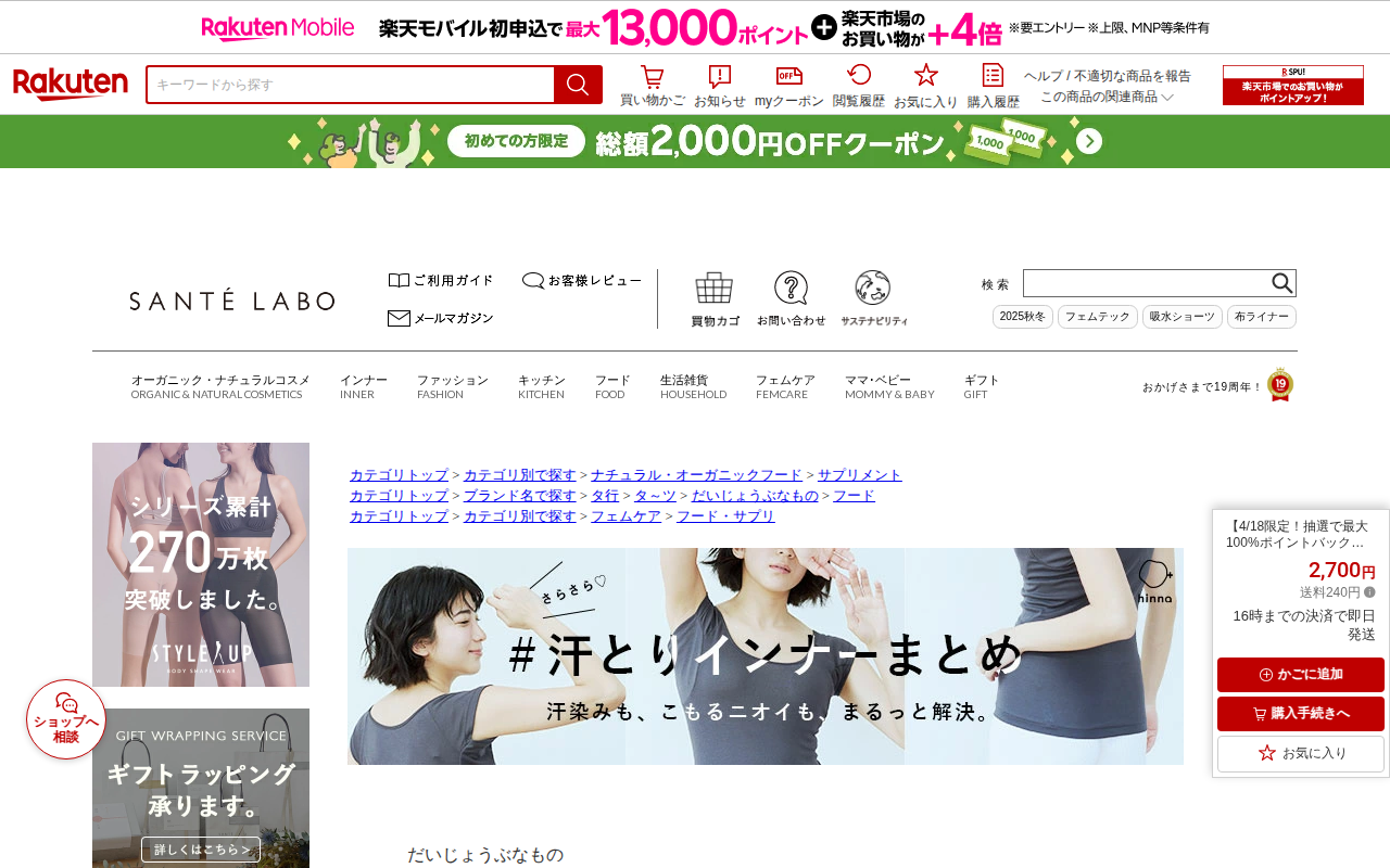 このページは、楽天市場で販売されている「だいじょうぶなもの」の国産有機きくらげを使用したビタミンDサプリメントの商品紹介です。60粒入り(1ヶ月分)で2,700円。有機きくらげをまるごとパウダー化した植物性ビタミンD2を...