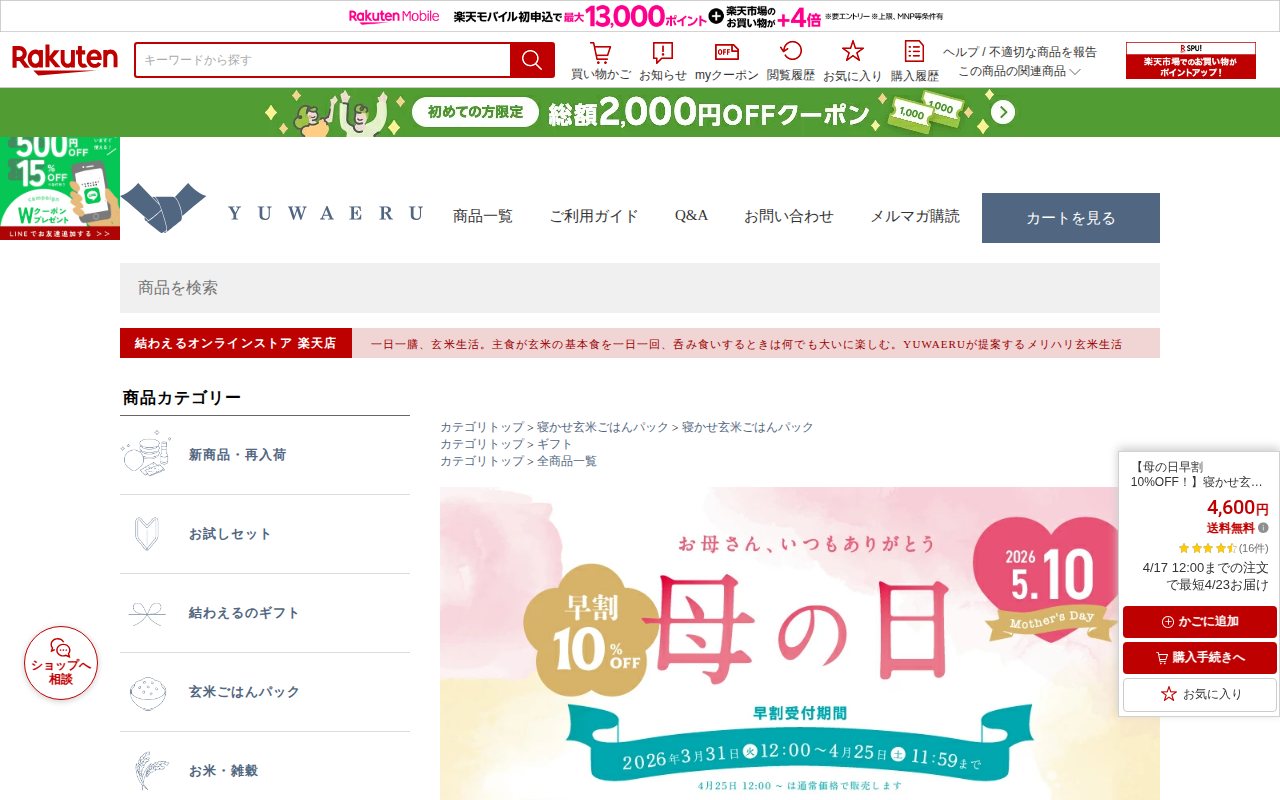 このページは、楽天市場で販売されている「寝かせ玄米と無添加カレーギフト」の商品ページです。母の日向けの早割10%OFF対象商品で、価格は4,600円(送料無料)。国産の寝かせ玄米ごはんパック(小豆、黒米、十五穀、もち麦ブ...