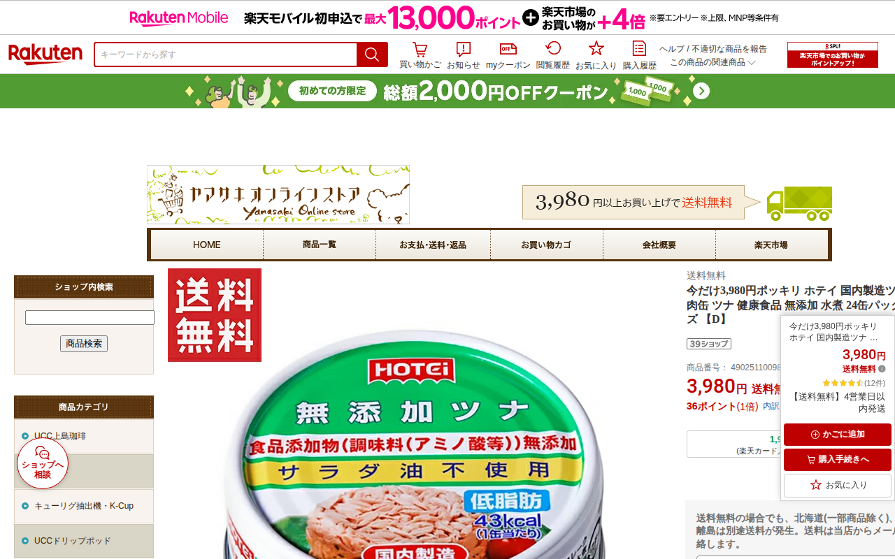 このページはホテイフーズの国内製造ツナ缶24缶パック(70g×24)を3,980円で販売する楽天市場の商品ページです。きはだまぐろをフレーク状にし、食塩のみで仕上げた無添加の水煮ツナで、食品添加物を使用していません。賞味...