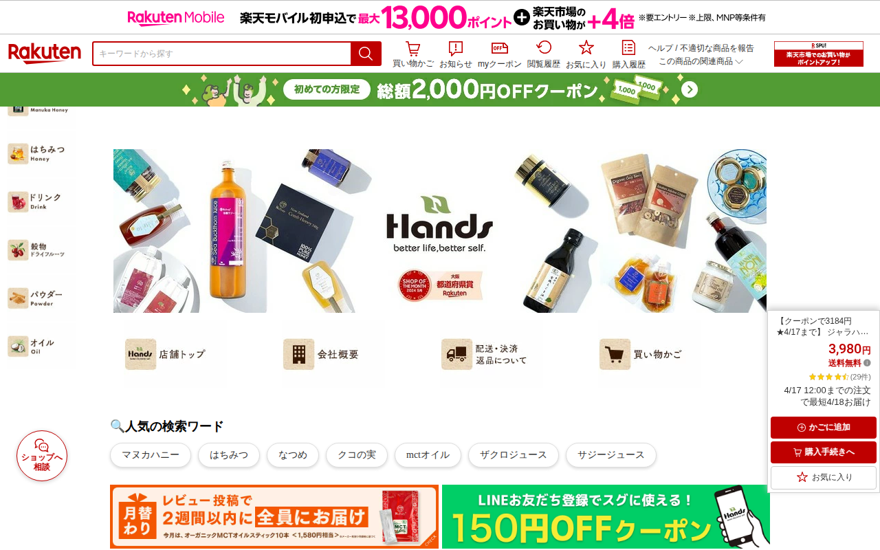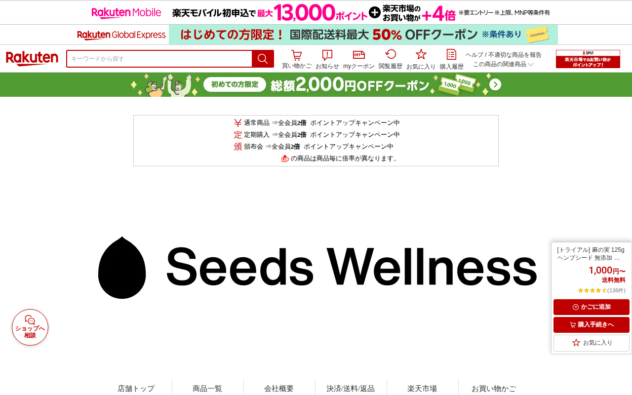 このページは、楽天市場で販売されているカナダ産の麻の実(ヘンプシード)125gのトライアル商品です。植物性タンパク質、オメガ3・6などの必須脂肪酸、食物繊維、ミネラルが豊富なスーパーフードで、無添加・オーガニック・非加熱...