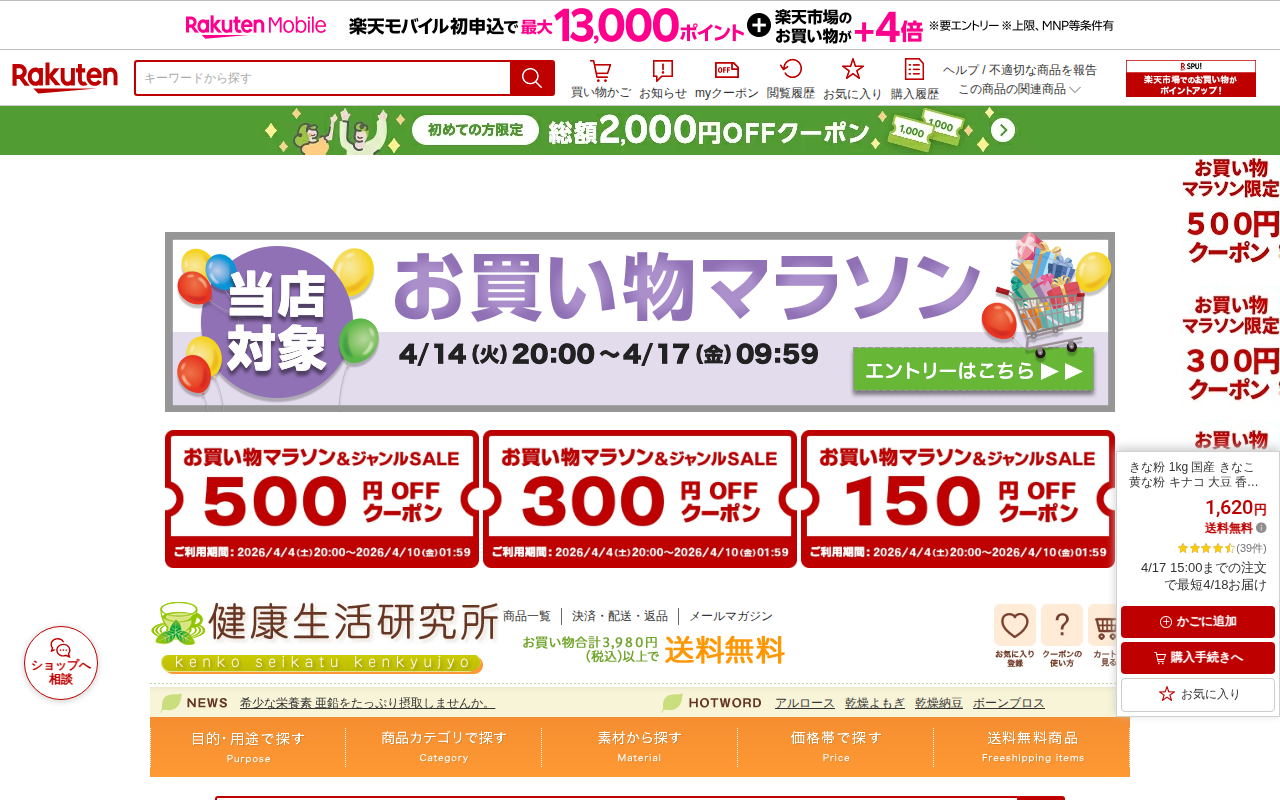 このページは、楽天市場で販売されている国産きな粉1kgの商品紹介ページです。北海道産の非遺伝子組み換え大豆を使用し、保存料・砂糖無添加で製造されています。香ばしい風味が特徴で、1,620円で送料無料です。きな粉はドリンク...